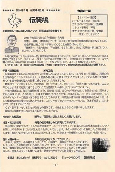 ジョークサロン 更新日の案内 : 2025年12月19日(金) リンクページは▶▶▶みっつをクリックして下さい NEW 12月例会は17日(水)に開催しました。リアル会場は千代田スポーツセンター7階第2集会室 同時にZOOMも併用しました。 参加はリアル12名、ZOOMは4名(+事務局)でした。 伝笑鳩435号が飛び立ちました。 2025年の一笑 投票をお願いします。 投票用紙 → クリックして活用下さい *2025年の一笑投票用紙 NEW カーピアセロムのページご覧ください カーピアセロム2025年冬将軍号が発刊されました。ジョークサロンメンバーのエッセイ、ジョーク満載です。 ▶▶▶伝笑鳩435号送付案内です ←クリックしてください ★北海道の自動車関連雑誌「カーピアセロム2025年錦秋号」が発行されました。 サロン同人 大鳥羽裕太郎のエッセイ、そして連載好評「ジョークの拾場」があります。 8項目目のカーピアセロムのページをクリックしてお楽しみください。 ☆サロン同人の個杉浦康司さんが発行していた滑稽新聞の最終号が届きました。 奥様の編集によるもので杉浦らんの写真入りメッセージがあります。 サロンメンバー一覧で杉浦さんの名前をクリックして下さい。杉浦さんのページで 最終号をご覧いただけます。 ▶▶▶ジョークサロン発足36周年を記念しての快鳥曽田英夫メッセージです。 例会雰囲気はZOOM録画でご覧ください。今月も皆さん、ニコリ、ホッコリです。 ZOOM最後は四字熟語リレーで楽しめます。 カーピアセロム2025年10+11月錦秋号が発刊です。ジョークサロンメンバーの エッセイ、笑品が溢れてます。カーピアセロムのコーナーをクリックしてご覧ください。 2025年新年会からみなさん ようこそ お越しいただきありがとうございます 1989年7月発足のジョークサロンは2025年7月36周年となりました。 「笑いは和来」をモットーとして もっと、もっと 笑おう、笑ってもらおうと取り組んでます。 435号表紙です 投票用紙付きです 会報「伝笑鳩」で 紹介される笑品の数々を ぜひ お楽しみください。 ▶下線または▶▶▶がついた項目はクリックで、詳しくご覧頂けます。(リンクしてます) ★ 3.(2)サロンメンバーの紹介ページ更新してます *カーピアセロム2025年10+11錦秋号にサロンメンバーのエッセイや笑品が掲載されてます。 項目8からどうぞご覧ください。 ジョークサロンは毎月第4水曜日に定例会を行っています。 14:00~16:00 リアル会場は 内神田にある千代田スポーツセンター7階の集会室です。 同時にZOOMも併用してましてご自宅から参加の方もいます。 川柳、都都逸、狂歌、回文、はめ字、ショートショート、4コマ漫画、ダジャレ日記などを持ち寄り、 披露しています。集まったみなさんがニコニコ笑っています。中にはワッハッハという人もいます。 それらの作品を開放的会報「伝笑鳩」に掲載して、全国へ発送してます。 まずは、11月実施の会合のご案内です。 *11月26日(水) ハイブリッド例会を実施。伝笑鳩434号が飛び立ちました。 例会最後に楽しむ 恒例の高齢四字熟語 を 下の3。 高齢四字熟語ページから見ることができますよ。 クリックしてください → ▶▶▶ リアル参加者一覧と伝笑鳩434号(送付案内)です ▶▶▶ 最新の伝笑鳩435号 ←クリックしてください。 投票用紙もあります。 →クリックして下さい *2025年の一笑投票用紙 リアル伝笑鳩435号の高木さんのどどいつに一部見にくい行がありました。 PDF435号ではクリアになっております。 ![]() 現在 例会に集まるメンバー や 読者の声があふれてる 開放的(高齢化にともない、今では介抱的かもしれません)会報です。 年間110円切手*15枚で読むことができますよ。連絡ください。 1.2025年12月17日(水) ジョークサロン例会に 集まった会員の案内です 右をクリック ▶▶▶12月参加者一覧 ←このページで名前をクリックして作品鑑笑してください これから12月の作品を順次アップします。 全員分が揃うまでしばしお待ちください。 順次、PDF化してアップ中です。 ![]() 2. 12月 の ZOOMも順調に撮影出来ましたよ。。 ▶▶▶ZOOM録画ページ を 設けました。 クリックしてご覧ください。 ここ数か月のZOOM録画一覧共有URLを案内します。雰囲気を味わってください。 3.サロン恒例の高齢四字熟語のページを新設しました。 ![]() ![]() ![]() ![]() リアル参加者、ZOOM参加者が共に楽しむリレーです。ぜひご鑑笑ください。 大人気 ▶▶▶高齢四字熟語 遊びです クリックしてください ++++++++++++++++++++++++++++++++++++++++ ジョークサロンの笑介をさせて頂きます。 ジョークサロンは1989年7月に発足しました。 下↓は30周年記念パーティーでの集合写真です。 ![]() 今も集うメンバーで和気藹々YY楽しく語らっています。 3. ▶▶▶ジョークサロン快鳥ご挨拶 (1) ▶▶▶ジョークサロン笑介 ジョークサロンの活動などを詳しく案内してます。 (2) ▶▶▶サロンメンバー(笑品笑介あり) サロンメンバーの顔写真とその笑品案内です *各メンバーの個別ページにつながるようになってます。 (3)ジョークをちょっと離れた作