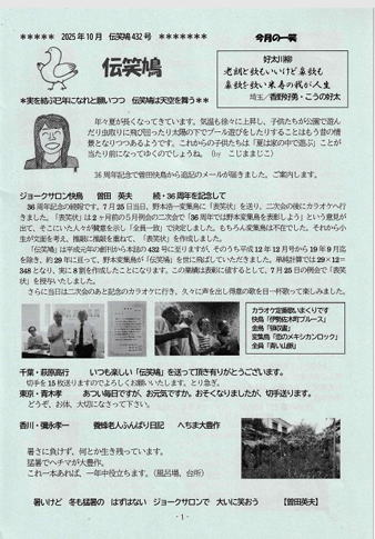 ジョークサロン![]() 更新日の案内 : 2025年10月21日(火) リンクページは▶▶▶みっつをクリックして下さい NEW 明日の例会は ハイブリッド例会です。 リアルは千代田スポーツセンター7階第2集会室 14:00~ ZOOM参加もあります。変集鳥・野本まで連絡下さい。招待状送ります。 NEW ★北海道の自動車関連雑誌「カーピアセロム2025年錦秋号」が発行されました。 サロン同人 大鳥羽裕太郎のエッセイ、そして連載好評「ジョークの拾場」が あります。 8項目目のカーピアセロムのページをクリックしてお楽しみください。 ☆サロン読者同人の浜田頓坊さん、松原伸伍さんからの都々逸、短歌も届きました。 サロンメンバー一覧のページから名前クリックでご覧ください。 ☆サロン同人の個杉浦康司さんが発行していた滑稽新聞の最終号が届きました。 奥様の編集によるもので杉浦らんの写真入りメッセージがあります。 サロンメンバー一覧で杉浦さんの名前をクリックして下さい。杉浦さんのページで 最終号をご覧いただけます。 ☆9月例会で披露された作品を全て堪能できます。お楽しみください。 今月の参加者一覧或いはサロン同人のページからお好きな同人の笑品をまずは ご覧ください。 ☆9月24日(水)にハイブリッド例会を開催しました。リアル参加10名 ZOOM参加4名です。 伝笑鳩432号が無事に飛び立ちました。 ▶▶▶伝笑鳩432号送付案内です ←クリックしてください ![]() ▶▶▶ジョークサロン発足36周年を記念しての快鳥曽田英夫メッセージです。 例会雰囲気はZOOM録画でご覧ください。今月も皆さん、ニコリ、ホッコリです。 ZOOM最後は四字熟語リレーで楽しめます。 カーピアセロム2025年8+9月号が発刊です。ジョークサロンメンバーの エッセイ、笑品が溢れてます。カーピアセロムのコーナーをクリックしてご覧ください。 ![]() みなさん ようこそ お越しいただきありがとうございます 1989年7月に発足のジョークサロンは今年7月36周年となります。 「笑いは和来」をモットーとして もっと、もっと 笑おう、笑ってもらおうと取り組んでます。 ![]() 会報「伝笑鳩」で 紹介される笑品の数々を ぜひ お楽しみください。 ▶下線または▶▶▶がついた項目はクリックで、詳しくご覧頂けます。(リンクしてます) ★ 3.(2)サロンメンバーの紹介ページ更新してます *カーピアセロム2025年8+9盛夏号にサロンメンバーのエッセイや笑品が掲載されてます。 項目8からどうぞご覧ください。 ジョークサロンは毎月第4水曜日に定例会を行っています。 14:00~16:00 リアル会場は 内神田にある千代田スポーツセンター7階の集会室です。 同時にZOOMも併用してましてご自宅から参加の方もいます。 川柳、都都逸、狂歌、回文、はめ字、ショートショート、4コマ漫画、ダジャレ日記などを持ち寄り、 披露しています。集まったみなさんがニコニコ笑っています。中にはワッハッハという人もいます。 それらの作品を開放的会報「伝笑鳩」に掲載して、全国へ発送してます。 まずは、9月実施の会合のご案内です。 *9月24日(水) ハイブリッド例会を実施。伝笑鳩432号が飛び立ちました。 例会最後に楽しむ 恒例の高齢四字熟語 を 下の3。 高齢四字熟語ページから見ることができますよ。 クリックしてください → ▶▶▶*リアル参加者一覧と伝笑鳩432号(送付案内)です ▶▶▶最新の伝笑鳩432号 ←クリックしてください。 ![]() 現在 例会に集まるメンバー や 読者の声があふれてる 開放的(高齢化にともない、今では介抱的かもしれません)会報です。 年間110円切手*15枚で読むことができますよ。連絡ください。 1.2025年9月24日(水) ジョークサロン例会に 集まった会員の案内です 右をクリック ▶▶▶9月参加者一覧 ←このページで名前をクリックして作品鑑笑してください 9月参加者の作品をアップしました。 ご鑑笑下さい。 ![]() 2. 9月 の ZOOMも順調に撮影出来ましたよ。。 ▶▶▶ZOOM録画ページ を 設けました。 クリックしてご覧ください。 ここ数か月のZOOM録画一覧共有URLを案内します。雰囲気を味わってください。 3.サロン恒例の高齢四字熟語のページを新設しました。 ![]() ![]() ![]() ![]() リアル参加者、ZOOM参加者が共に楽しむリレーです。ぜひご鑑笑ください。 8月の四字熟語しばしお待ちください。もうすぐアップします。 大人気 ▶▶▶高齢四字熟語 遊びです クリックしてください ++++++++++++++++++++++++++++++++++++++++ ジョークサロンの笑介をさせて頂きます。 ジョークサロンは1989年7月に発足しました。 下↓は30周年記念パーティーでの集合写真です。 ![]() 今も集うメンバーで和気藹々YY楽しく語らっています。 3. ▶▶▶ジョークサロン快鳥ご挨拶 ![]() (1) ▶▶▶ジョークサロン笑介 ジョークサロンの活動などを詳しく案内してます。 (2) ▶▶▶サロンメンバー(笑品笑介あり) サロンメンバーの顔写真とその笑品案内です *各メンバーの個別ページにつながるようになってます。 (3)ジョークをちょっと離れた作品も紹介します ▶▶▶ スペシャルギャラリー (カット